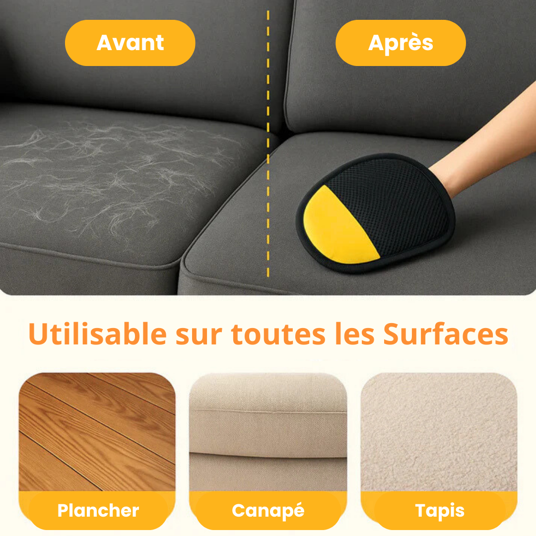 Des touffes de poils de chien sur vos canapés aux poils de chat sur vos vêtements, LE Gant Magique anti-poils s'occupe de tout .
