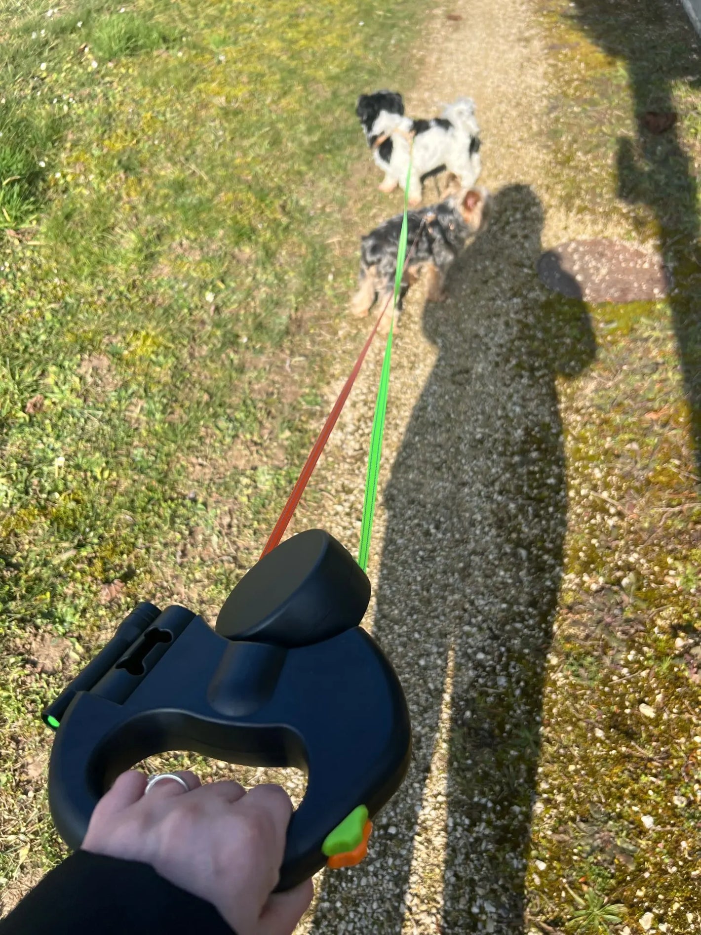Imaginez la liberté de promener vos deux chiens d'une seule main. La conception pivotante de La Double Laisse permet à vos chiots de se déplacer en douceur, côte à côte. Vous sentirez immédiatement la différence : plus de tiraillements ni d'emmêlements, juste une promenade calme et contrôlée.
